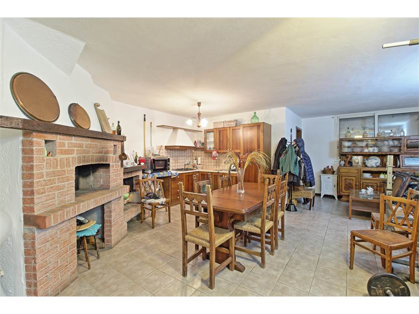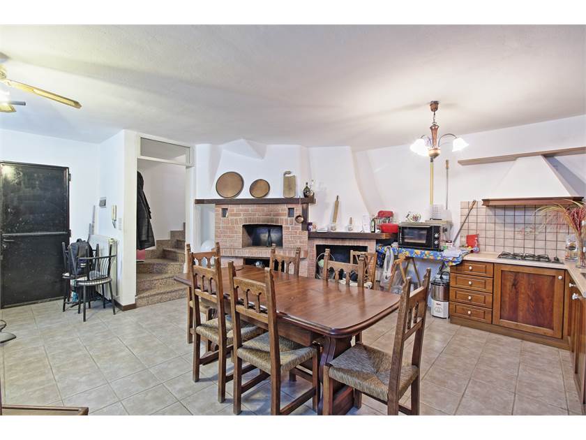All’interno troviamo un ampio soggiorno con cucina a vista e camino a legna, perfetto per creare un’atmosfera calda e conviviale.
