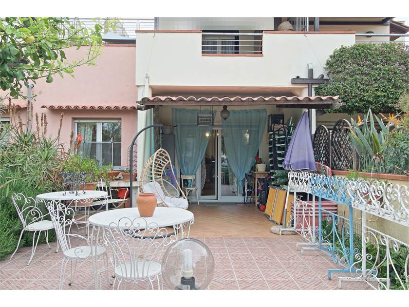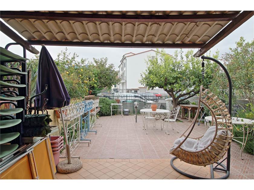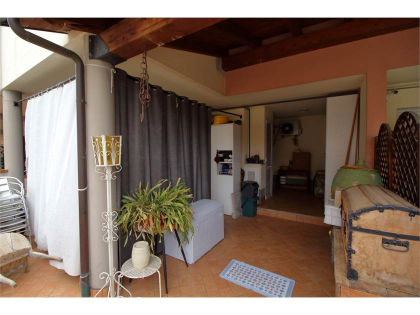 L’ingresso si apre su un cortile privato che conduce a una suggestiva loggia coperta, ideale come zona relax o pranzo estivo.