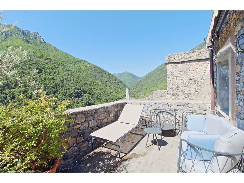 Spazio Esterno: Una meravigliosa terrazza offre una vista impareggiabile sulla Val Pennavaire. Attrezzata con lettino prendisole e un tavolo da pranzo per quattro persone, è lo spazio ideale per godersi la tranquillità e la bellezza del paesaggio.