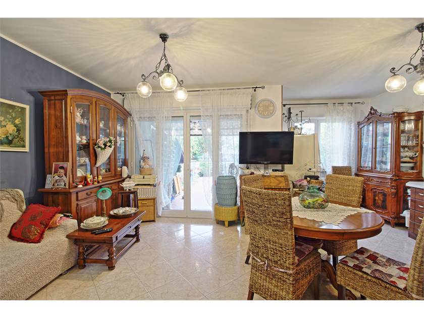 Dal soggiorno si accede a una seconda loggia e al giardino esclusivo, spazio ideale per chi ama vivere all’aperto.