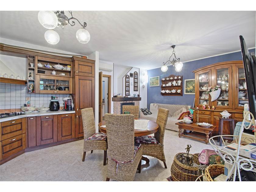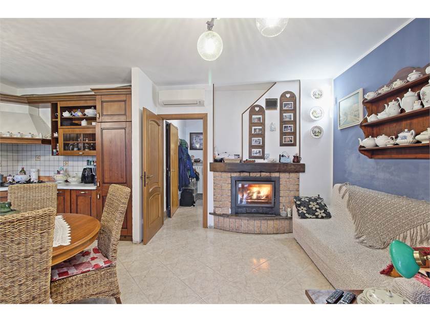 All’interno troviamo un ampio soggiorno con cucina a vista e camino a legna, perfetto per creare un’atmosfera calda e conviviale.