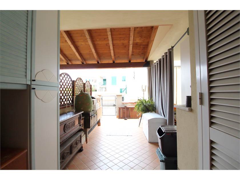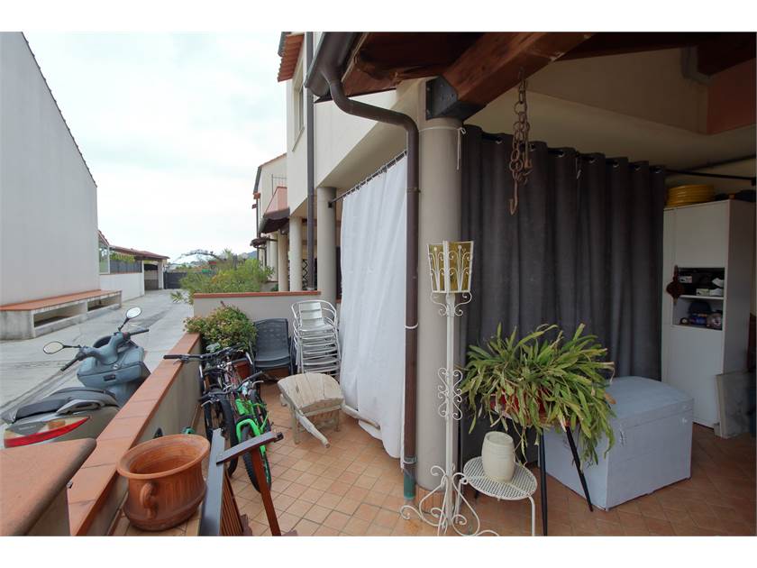 L’ingresso si apre su un cortile privato che conduce a una suggestiva loggia coperta, ideale come zona relax o pranzo estivo.
