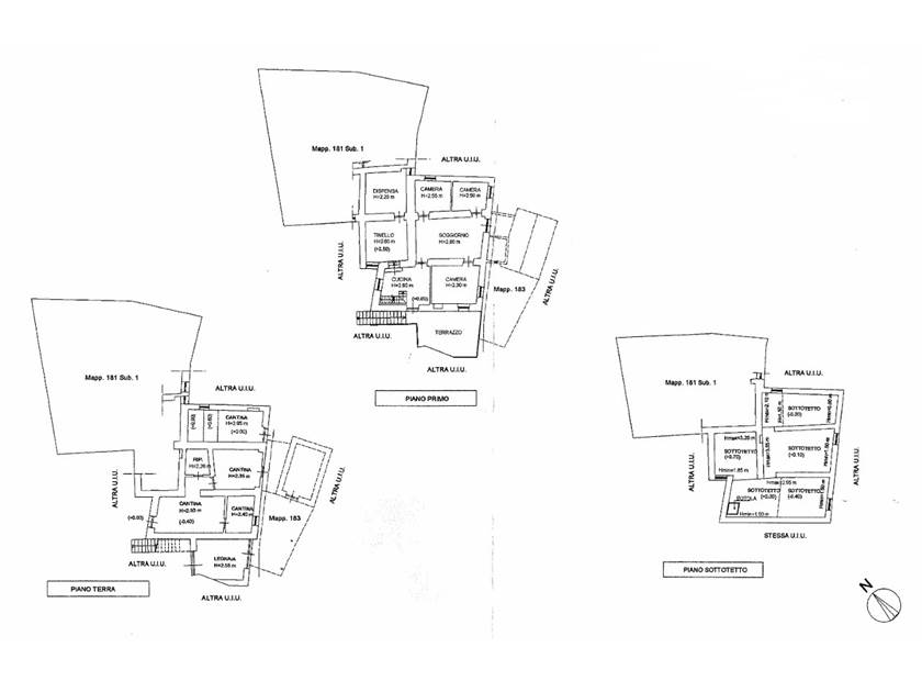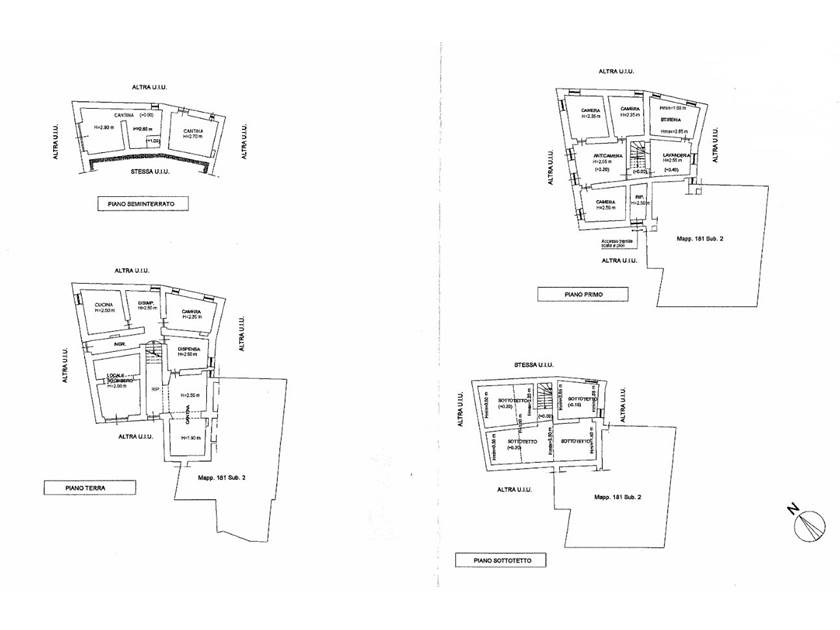 - Quattro livelli: seminterrato con due cantine; piano terra con ingresso, cucina, disimpegno, camera, dispensa e locale di sgombero; piano primo con tre camere da letto, due locali di sgombero e un ripostiglio; sottotetto.