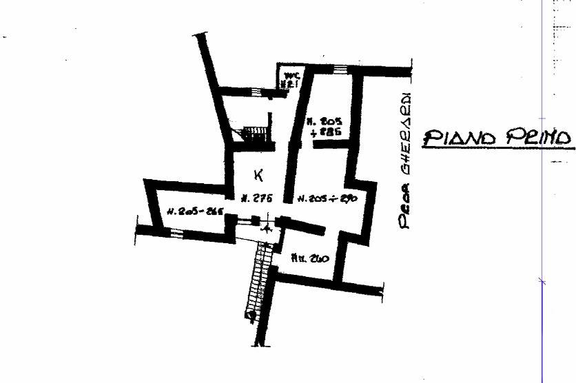 Primo Piano: Accessibile tramite una corte comune e una scala esterna, il primo piano di circa 80 mq calpestabili è suddiviso in: Cucina abitabile con stufa a legna; da qui si accede a un ampio Salone, due Camere da letto, un Soggiorno e, tramite un disimpegno, al bagno finestrato con doccia.
